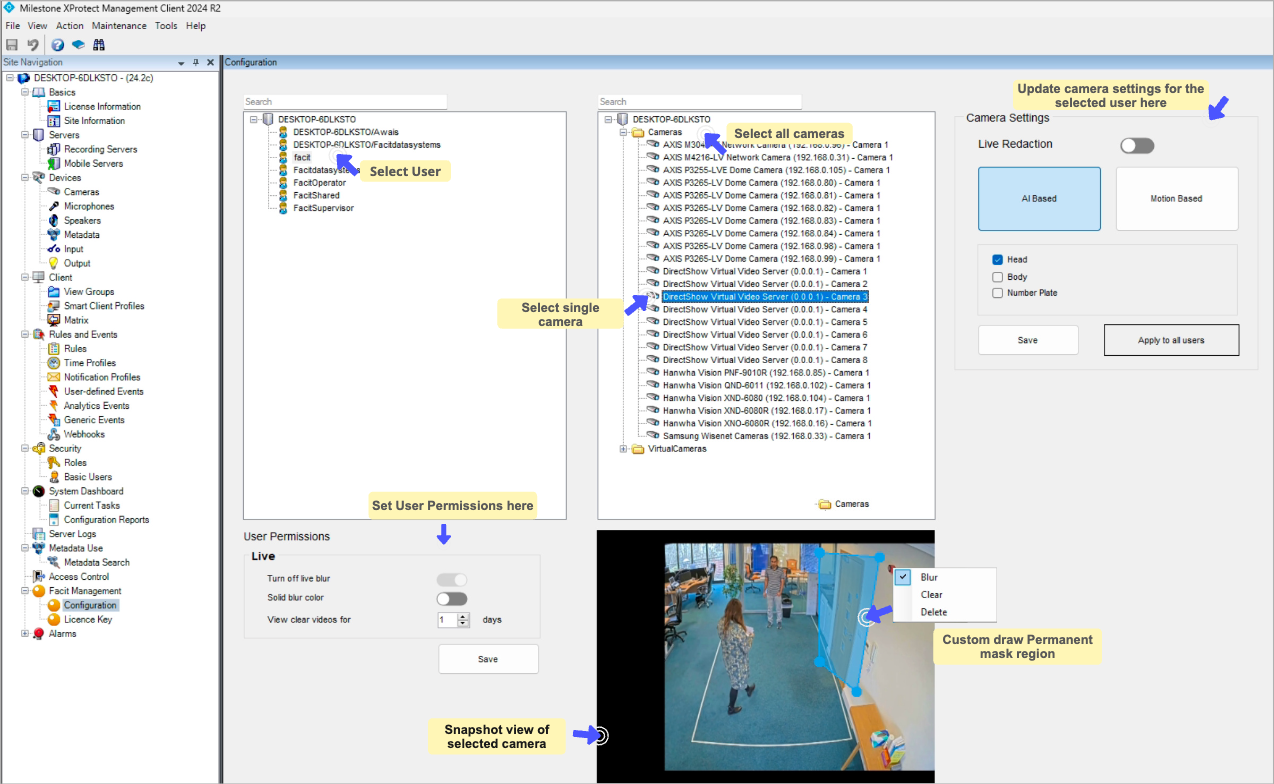 Milestone users with Administrator role can configure these permissions through the Milestone Management Server for specific users. This ensures users only have the appropriate redaction capabilities when viewing live camera feeds in XProtect Smart Client.